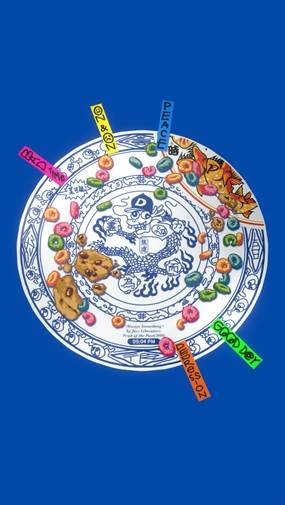 在本次作品中,2Dogg 特別分享三件作品印象最深:展開於焦慮情緒的《盤子01-9:04p.m.》,將之前在美國唸書時愛吃的甜點喜瑞兒與青花瓷圖樣並置,構成一種甜膩與緊張共存的矛盾氛圍。